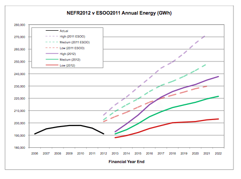 The best reflection of this is in the ability of industry bodies such as the Australian Energy Market Operator to predict future demand. Since the 1960s, this has been relatively easy, but in the last couple of years, its prediction, and those of the industry’s – have been trashed by the “significant” changes it says are occurring in the market. Today, it released a report that conceded demand for 2011/12 was 5.7 per cent below forecast of just a year ago. Its updated predictions for 2012/13 are now 8.8 per cent below the forecast made 12 months ago.