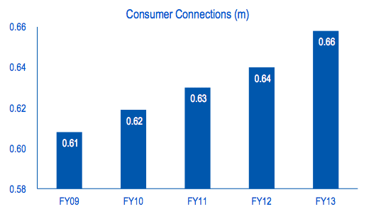 That was all good while demand was increasing, as everyone supposed it would. But SP Ausnet’s results for 2013 show how the game is starting to change. Over the last five years its electricity distribution business has grown its customer base by around 8 per cent, as this first graph shows. That is to be expected given the population and economic growth.