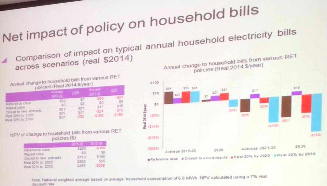 Data released to an industry workshop held by the RET Review panel on Monday has shown what other research had already demonstrated, here, here, here, here, here, here, here, and here – that under all the scenarios where renewable energy is encouraged into the market, household electricity prices actually fall.