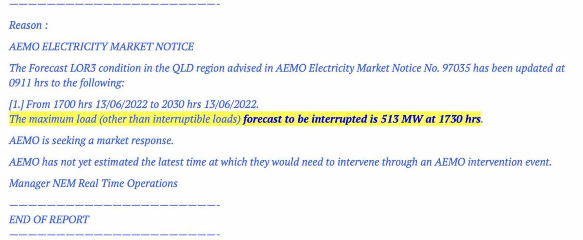 AEMO initially said up to 173MW of load may have to be curtailed between 1730 and 1900 AEST. It quickly updated this to a potential shortfall of 513MW – or the equivalent of one quarter of Brisbane’s total demand, according to analysts at WattClarity.