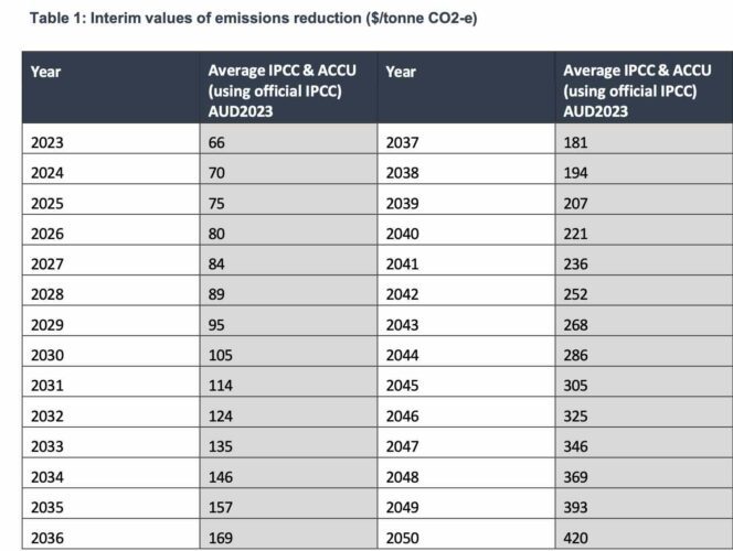 The Australian Energy Regulator has now published an interim guide on the “value of emissions reduction”, or VER, with the price starting at $66 a tonne of Co2 equivalent in 2023, rising to $135/t in 2033, and to more than $400/t from 2050.