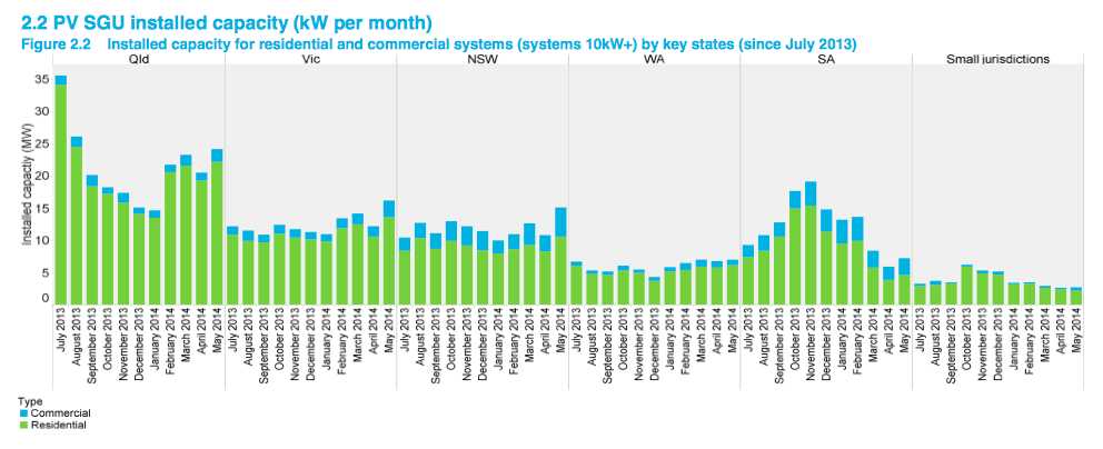 20MW a month or 250Mw a year is astounding, and the number in Queensland is growing despite cuts to subsidies and FiT, they are adding the equivalent of a small gas power plant or about half a coal , power plant per year just in rooftop installations. Meanwhile a new report shows total demand in the NEM has fallen 3% in the first quarter of 2014, which means solar is supplying an ever growing proportion of an ever shrinking total, the effect of this on the wholesale market will have rapid and profound effects on the ability of coal power plants to remain viable.
