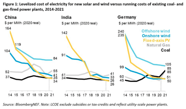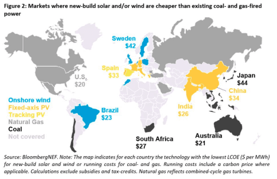 In Spain and France, the levelised cost of new solar farms is now lower than the cost of running coal plants, while in the UK, Sweden, coal-hungry Poland, and Brazil new onshore wind is cheaper than existing coal.