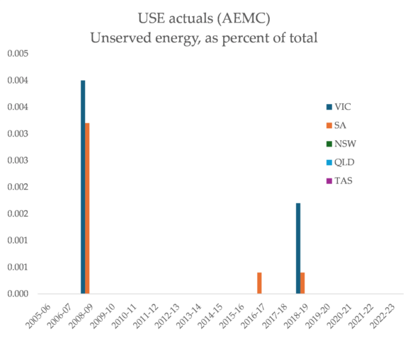 As the proportion of wind and solar grows from nearly zero at the start of that time period to around 30% in FY2022-23, there has been no corresponding rise in unserved energy. This is despite years (maybe decades?) of media outlets treating AEMO’s annual ESOO report as a harbinger of blackout doom.