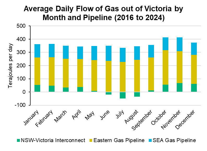 Sources: Australian Energy Regulator via: 1) www.aer.gov.au/industry/registers/charts/average-daily-flows-sa-demand-region-monthly 2) www.aer.gov.au/industry/registers/charts/average-daily-flows-nswact-demand-region-monthly . Note: the small negative values over winter for the NSW-Victoria Interconnect indicate that pipeline is delivering gas inward to Victoria, all remaining positive values indicate flow out of Victoria.