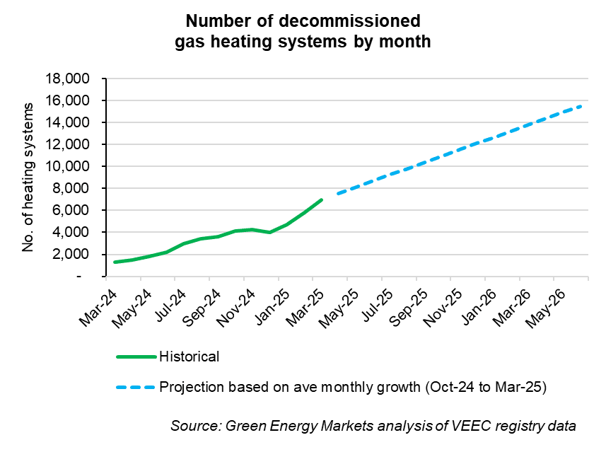 The chart below illustrates in the green line the number of gas heaters (almost all gas central ducted systems) that have been decommissioned under the VEU program per month since March 2024 up until March 2025.