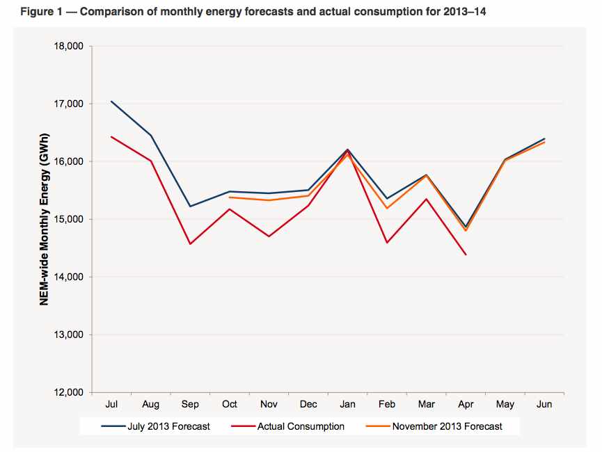 This came after the first quarter of the financial year produced a result 3.5 per cent below expectations. That prompted AEMO to cut its forecasts for 2013/14 by 1.3 per cent, but the latest data shows actual consumption was 3.1 per cent below that revised forecast in the last three months.