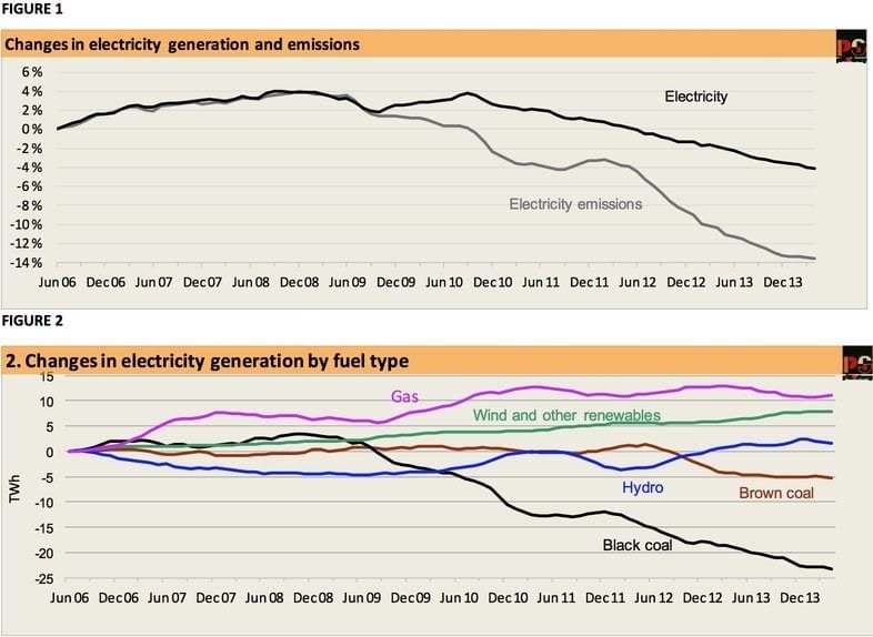 Annual electricity supply and demand in the NEM for the year ending April 2014 showed a continuation of trends seen in the year ending March 2014 and described in the last CEDEX® report. Demand and total generation fell slightly (Figure 1), as did supply from both black and brown coal fuelled generators. Hydro generation continued to fall, while wind generation increased slightly and gas generation increased more significantly (Figure 2). The overall outcome was further small falls in both generation and emissions. Compared with the year ending April 2013, the fall in generation was 4.4 TWh, equivalent to 2.4%, and the fall in emissions was 5.8 Mt CO2‐e, equivalent to 3.5%.