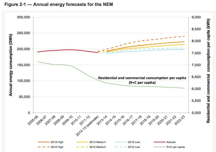 This comes a year after AEMO slashed its forecasts for 2012/13 by nearly 10 per cent. As it is, demand for 2012/13 looks to have come in 1.1 per cent below event that forecast.
