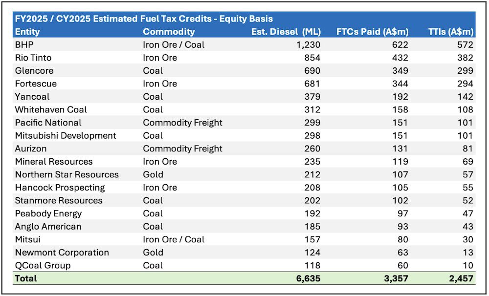 CEF has tracked 18 of the largest consumers of diesel in Australia, all of which cumulatively benefit from billions in subsidies under the FTC Scheme. In the 2025 financial year, these companies were collectively refunded $3.36 billion.