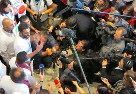 Kumi Naidoo, executive director of Greenpeace, addressing the media about the walkout. Photo credit: Brendan DeMelle, DeSmogBlog