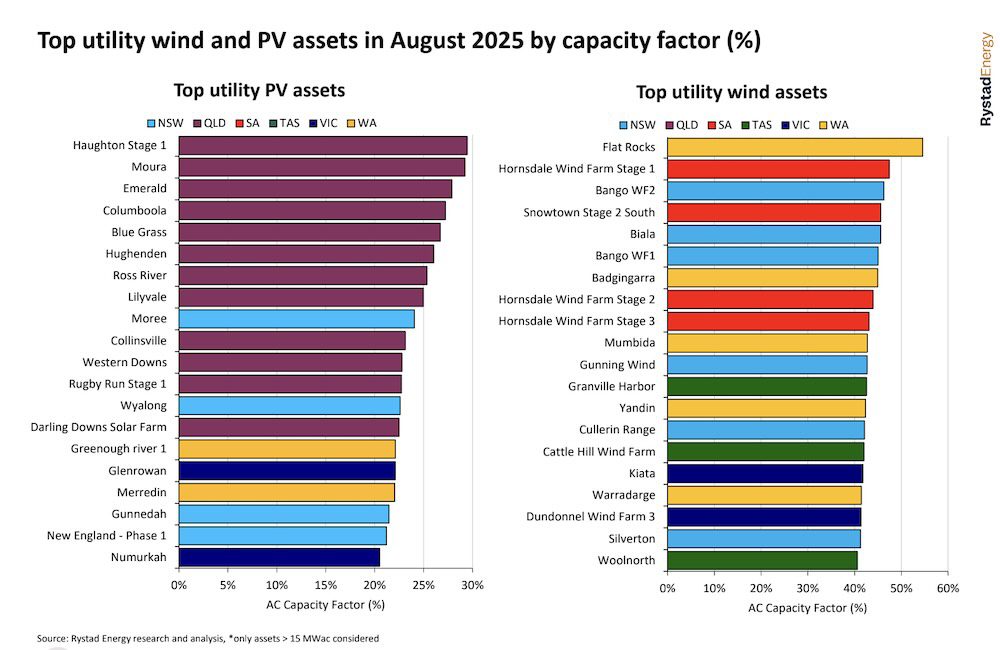 That said, the nation’s top performing wind assets for the month were mostly located in Western Australia, South Australia and New South Wales, led by Potentia Energy’s Flat Rocks wind farm in WA, with a capacity factor (CF) of 54.6%.