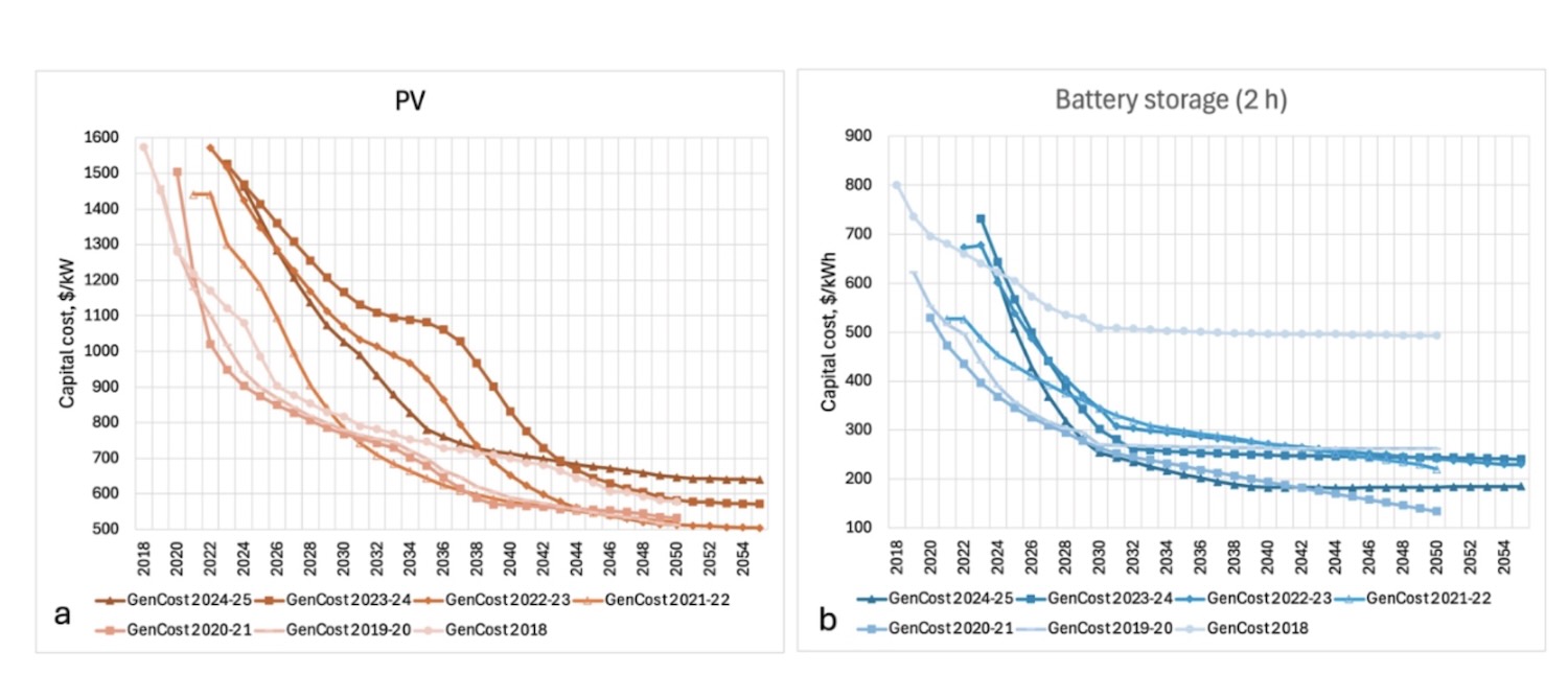 Projections for future PV and battery costs before and after COVID-19. Data source: GenCost reports 2018 to 2024-25