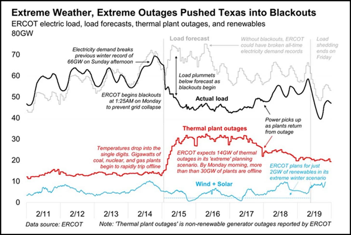 The same problems hit Texas in a 2011 blackout – coal piles froze, coal plants froze, and gas infrastructure froze, leaving millions without power.