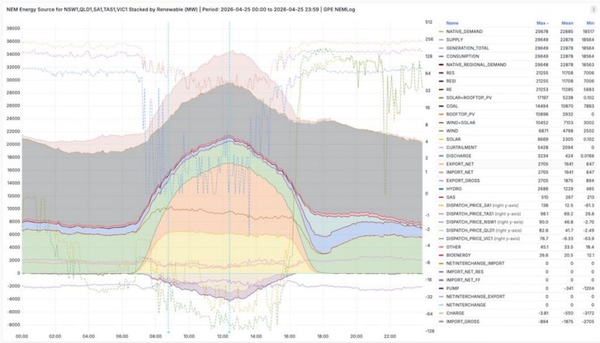 – 12:25 – Battery charging reached 10.7% of NEM consumption, passing the previous record of 9.5% set at 13:05 on Sun 29 Mar 2026. The record standing one year earlier was 4.6% at 11:05 on Thursday 10 Apr 2025.