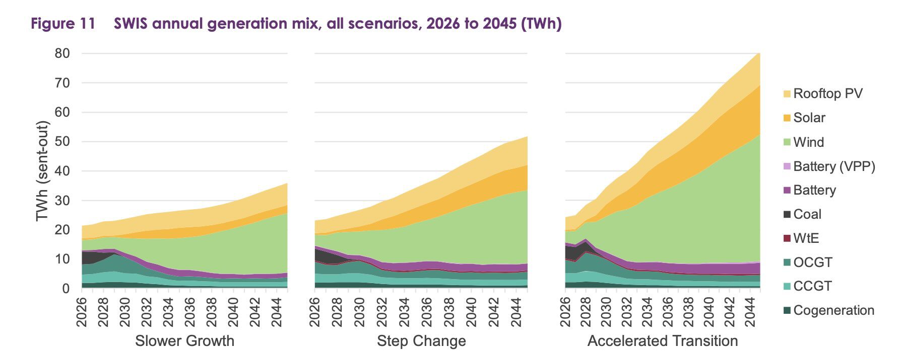 This is because annual contributions from large-scale wind and solar generation are forecast to increase from 4.2 terawatt hours (TWh) in 2026 to 33.4 TWh in 2045.