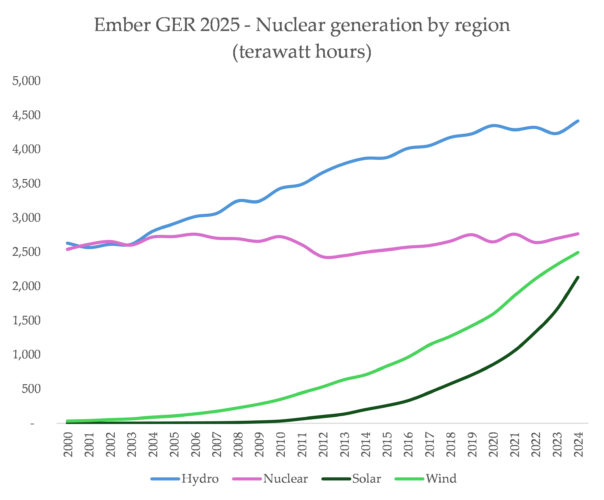 The global nuclear industry has also seen a rise in absolute power generation as well – but like gas, its share of total global power generation is decreasing every year. Importantly, you can see how wind, solar and hydro have been steadily rising for a long time now – but nuclear has fluctuated around a steady state: