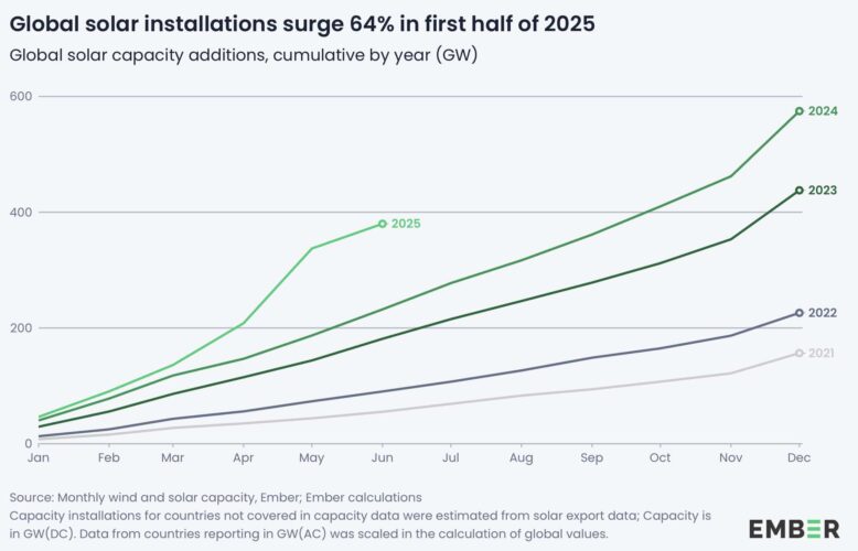 “2025 is on track to become another historic year for solar power,” Ember says. “The numbers highlight not only solar’s momentum, but also its pivotal role in reshaping the global energy system.”