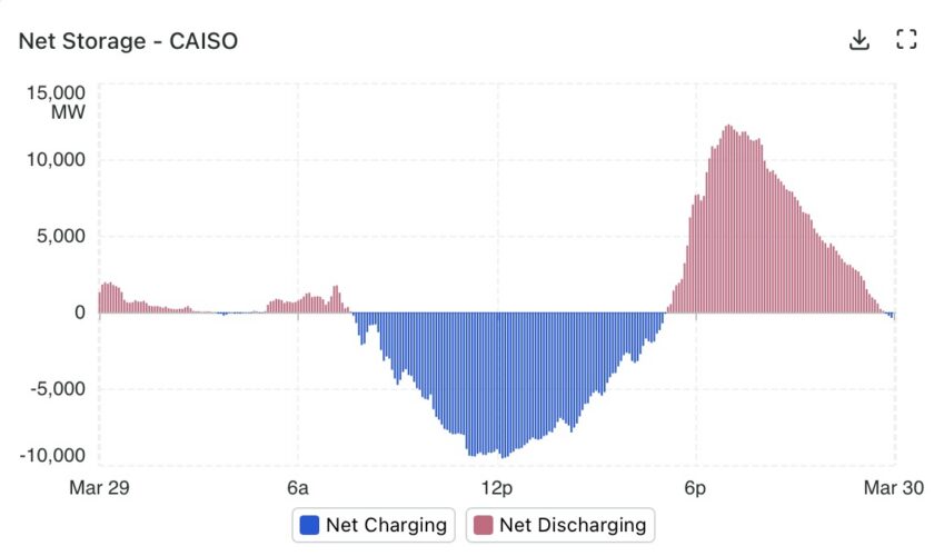 According to data from Grid Status, the peak output of battery storage in California hit a new peak of 12,293 megawatts at 7pm local time on Sunday, March 29. That equated to 44 per cent of demand, its record tracker stated (that’s the big purple blog in the graph above).