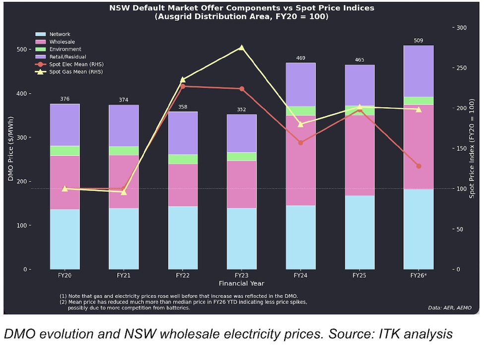 The DMO (default market offer) has grown at a 6% compound pace from FY20 through FY26, led by an 11% CAGR (Compound Annual Growth Rate) in wholesale (generation costs) and 5% CAGR in network costs. Network unit costs are rising for a variety of reasons but flattish volumes are one cause.