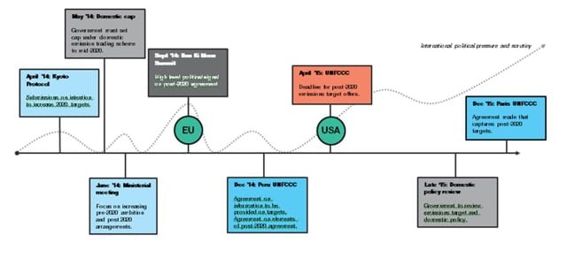 Figure 1. International and domestic emission reduction goal processes (2014-2015). The stylised line indicates the level of international political pressure and scrutiny of Australia’s emission reduction goals. Light grey boxes are Australia’s domestic target setting processes. When Australia’s international peers may advance their post-2020 emission reductions offices is also indicated.
