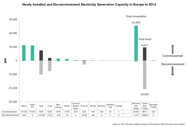 The graph below illustrates the overall point well. Last year over 25,000 megawatts (MW) of renewable energy were installed in the EU. At the same time only 9,600 MW of fossil fuels (mostly gas) were installed and over 20,000 MW of gas and coal closed.
