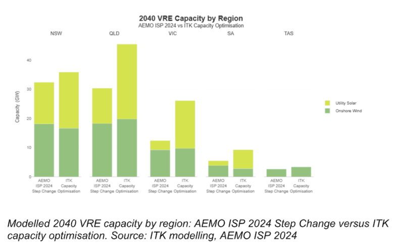 Due in part to continued capital cost reductions for battery energy storage systems (BESS) and also its dispatch flexibility compared to wind, the optimiser favoured a much more solar/BESS heavy mix than the Australian Energy Market Operator’s (AEMO) 2024 ISP Step Change scenario.