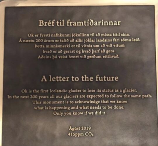 The plaque (below) reads: “In the next 200 years, all our (Iceland’s) glaciers are expected to follow the same path. This monument is to acknowledge that.”