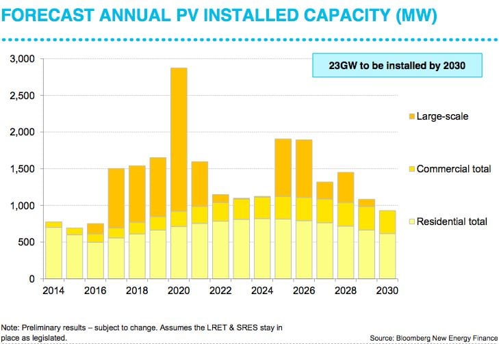 Kobad Bhavnagri, head of BNEF in Australia, told the 2014 Solar Conference and Expo in Melbourne on Thursday that BNEF expected around 23GW of large, commercial and residential solar PV to be installed in Australia by 2030.