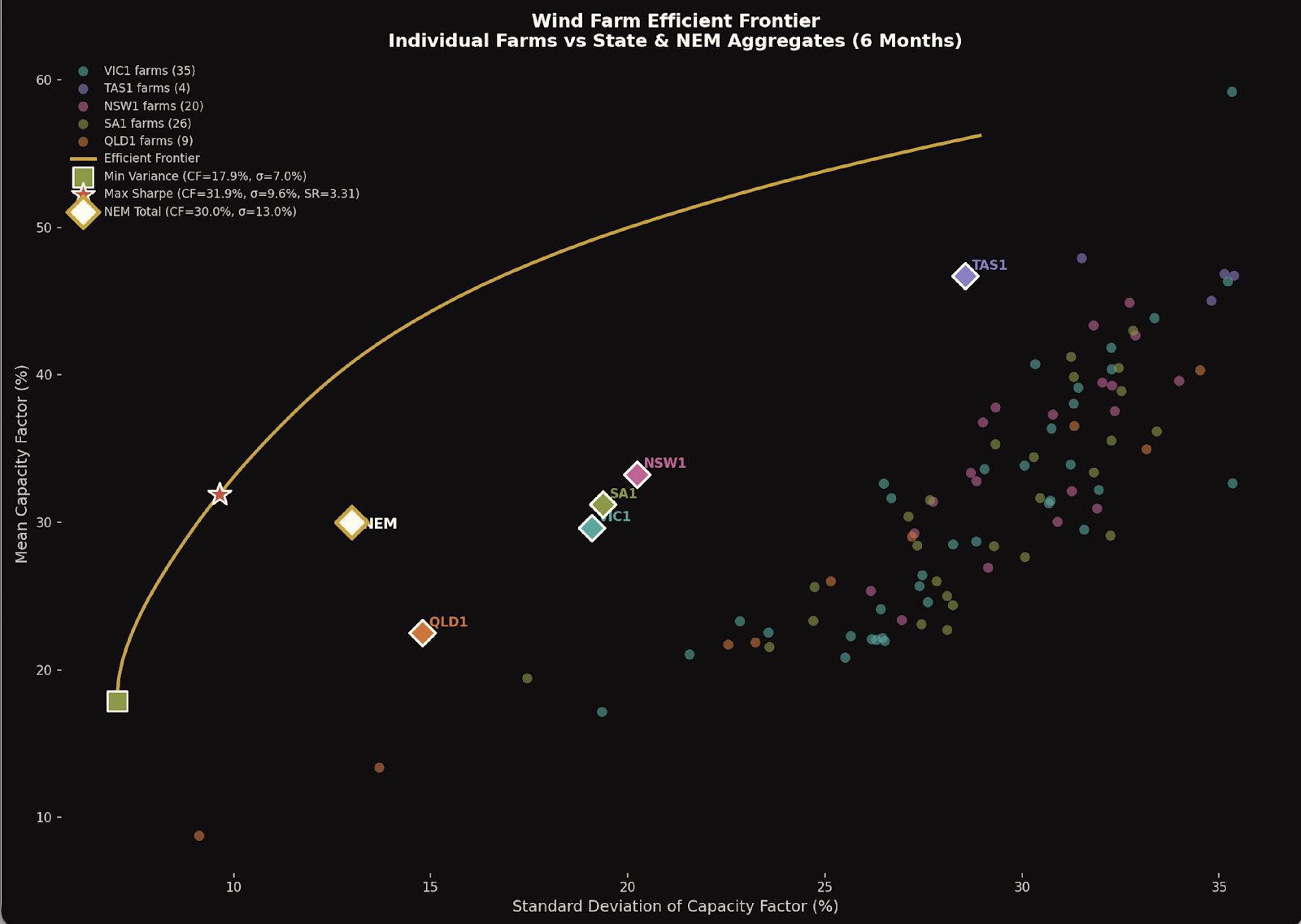The diamonds show for each State the capacity factor and standard deviation of all the wind farms in that State aggregated, as well as the NEM portfolio. Again, the plot clearly shows that owning a share of a State-wide wind portfolio is a much better deal than owning any individual farm.