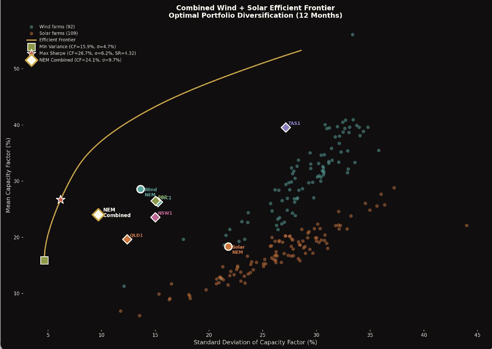 The red star is the theoretical best weighted portfolio and it reflects the portfolio of wind farms and how much of each wind farm’s capacity that say a data centre or an aluminium smelter would buy if it wanted to minimise its firming cost and didn’t have any solar.