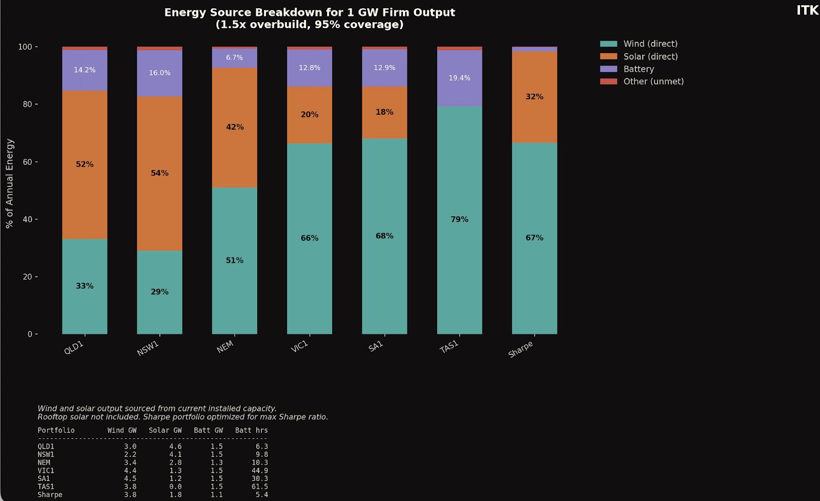 The larger and the more diversified, but particularly the higher the Sharpe Ratio of a renewable portfolio, the lower its overall cost to provide flat load power to the likes of aluminium smelters and data centres;