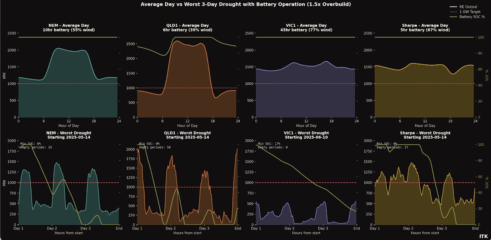 You can see the different systems and consequences in the following visualisation. Note the Victorian 43 hour battery doesn’t empty in this situation because I limit the drought to 3 days. There’s a fair bit to take in, in the visualisation.