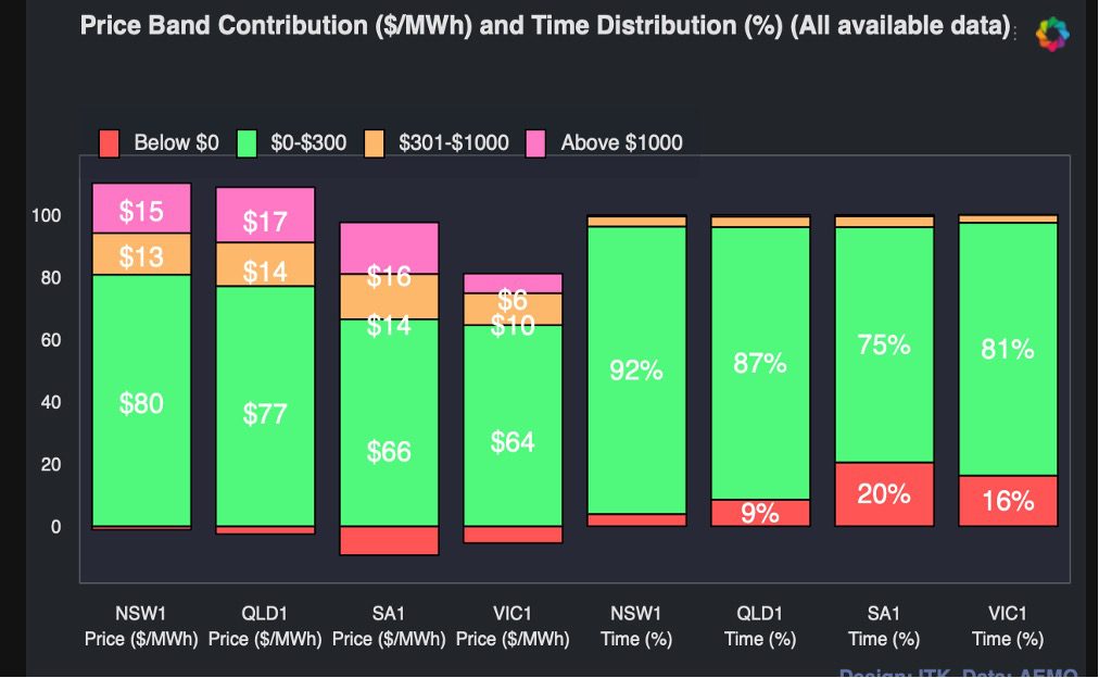 – $37/MWh or about 35% of the average South Australian price in the past year was due to periods when prices were over $1000/MWh and a lesser but still meaningful 18% of the QLD average price was due to prices over $1000/MWh.