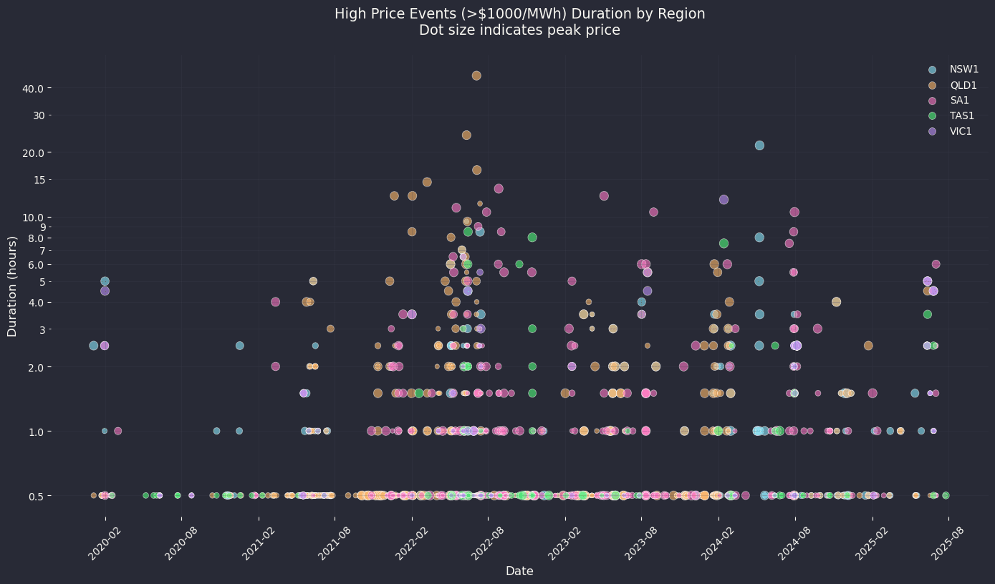 The majority of high-price events were short-lived, with between 52% and 63% lasting less than 30 minutes. On average, these events lasted between 1.1 and 1.5 hours across all regions. Some extreme events did occur: the longest recorded was in QLD, where prices remained above $1000 for 45.5 hours in July 2022. In NSW1, the longest event lasted 21.5 hours in May 2024, reaching prices as high as $16,600.