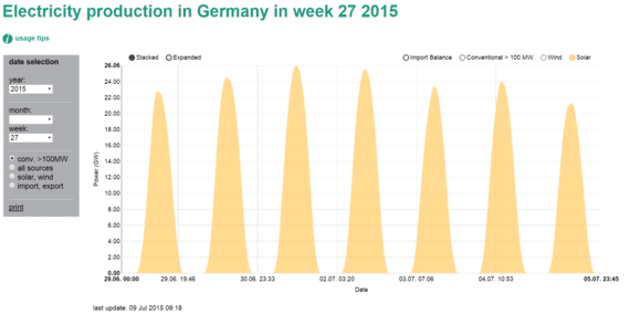 On 21 April 2015, Germany posted a new record for solar power production, originally reported at just below 25 GW so the level of 26 GW on July 1 would be a new record (strangely, I have not seen it reported as such – the record from April was widely celebrated immediately). However, Fraunhofer ISE adjusted that figure from April upwards to 27.3 GW in its recent overview (PDF in German). Note that Agora reports only 23.15 GW of solar power on July 1 and 25.8 GW for 21 April 2015.