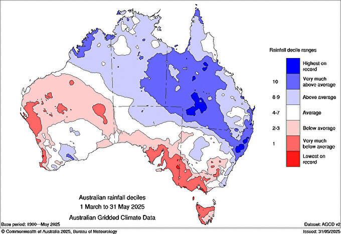 Following Cyclone Alfred in early March, the north-eastern half of the country has experienced above-average rainfall, with Queensland experiencing its sixth-wettest autumn on record.