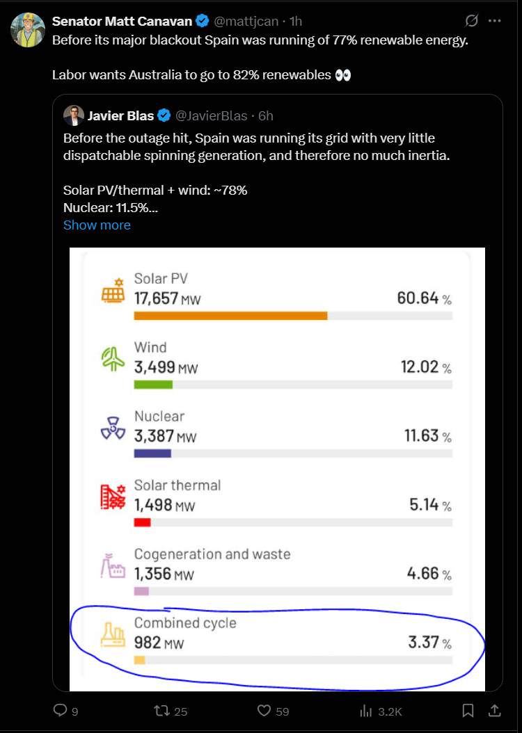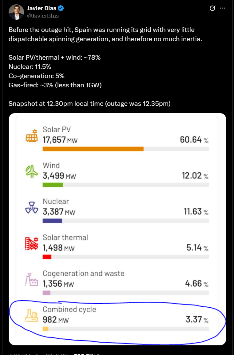 One of the worst offenders has been Bloomberg columnist Javier Blas, who implicitly blamed the blackout on excess solar and wind power generation resulting in ‘not much inertia’.