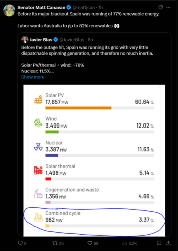 The denialist Substack “energy transition absurdities” cited Blas’ post, as did the right-wing blog ZeroHedge. The Daily Mail specifically cite Javier Blas in their frantic, rushed article blaming renewable energy for the blackout: