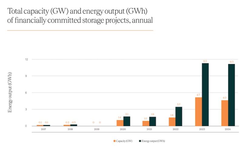 Large-scale storage for the quarter saw 870 MW / 1,936 MWh worth of projects reach financial commitment, the report says, capping off “another outstanding year” where 4,029 MW / 11,348 MWh of new projects were committed.