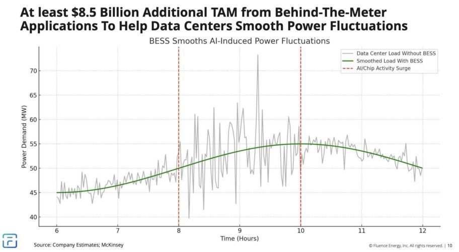Batteries can act as a buffer, absorbing rapid surges in power and releasing it during high demand intervals, effectively levelling out the fluctuations that come with AI driven compute cycles.