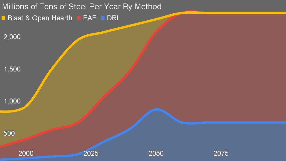 In my current projection of global steel through 2100, the world sees a significant shift, with 75% of demand met by scrap steel fed through electric arc furnaces, and various direct reduction of iron technologies delivering the 25% of new steel required.