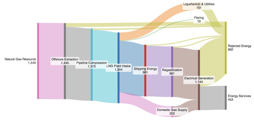 LNG is so expensive that it’s the fuel of last resort, so it’s better to think of it as burned half in peaker plants, which are much less efficient than combined cycle gas turbines, hence the reason I used 40% for the Sankey diagram.