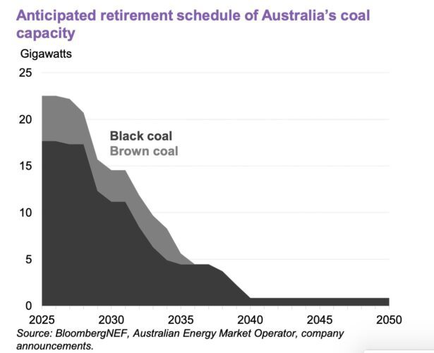 “Over the next 10 years, BNEF expects 16.9GW, or 75 per cent, of coal capacity will retire,” it writes in the new analysis. By 2040, the only remaining capacity will be 852 MW in Queensland, which could continue until 2050, even though the market operator has expressed its doubts about the reliability of such plants.