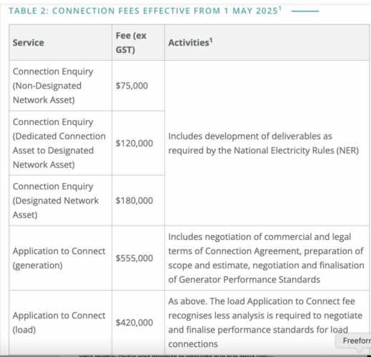 The new fees, effective from May 1, range from $75,000 to $180,000 for processing a connection enquiry, and up to $555,000 for a connection application, which includes Powerlink’s costs for the negotiation of generator performance standards.