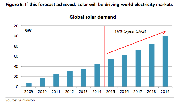 UBS notes that US solar group SunEdison predicts that solar can maintain a 16 per cent compound annual growth rate over the next five years. That will take annual installations to around 100GW by 2019. That’s as much as had been installed cumulatively across the world up to the end of 2012, and as much new generation (all fuels included) that is installed each year in China.