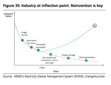 “Two years ago “grid defection” had to be explained as a concept,” says UBS utilities analyst David Leitch. “Now every electricity business and player from generators, retailers, networks and regulators are adapting to a world where demand falls, customers can be competitors, network owners are generators and the only constant is change.”