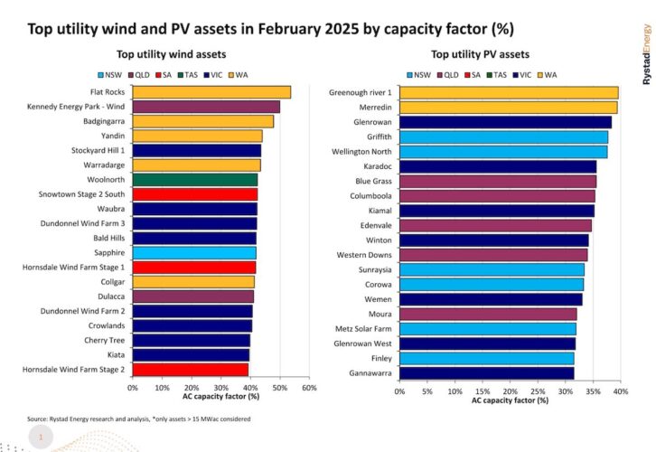 According to the latest data from Rystad Energy, Western Australia’s main grid was home to four of the 10 best performing wind assets for February, with Potentia Energy’s small but punchy 18 turbine Flat Rocks wind farm taking out top spot with a capacity factor (CF) of 53.7 per cent.