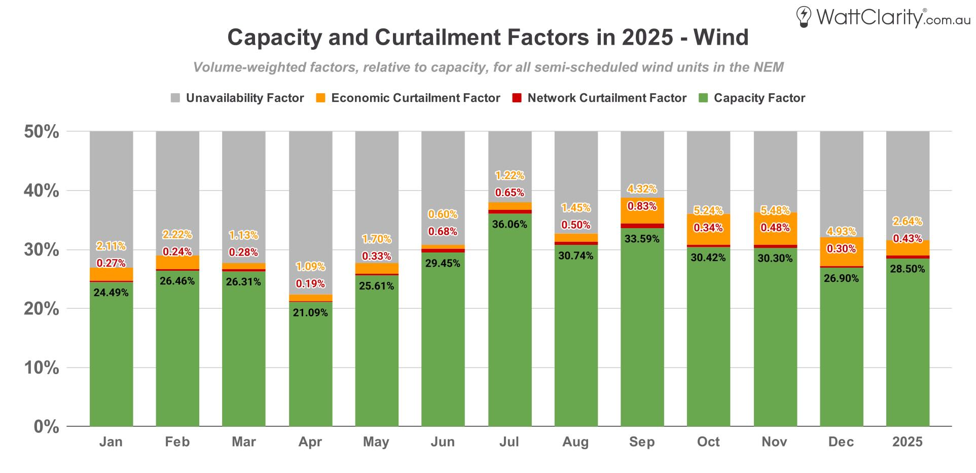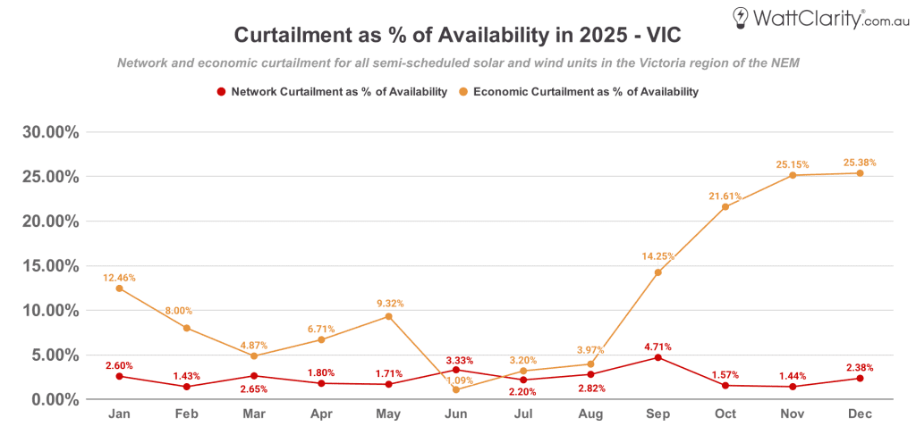 When combined, we see shades of some familiar seasonal patterns. The period from April to June continued to record the lowest levels of both availability and production across the VRE fleet as a whole. We can also see that 2025 amplified an emerging pattern already visible in past years — economic curtailment is increasingly concentrated in spring and summer.