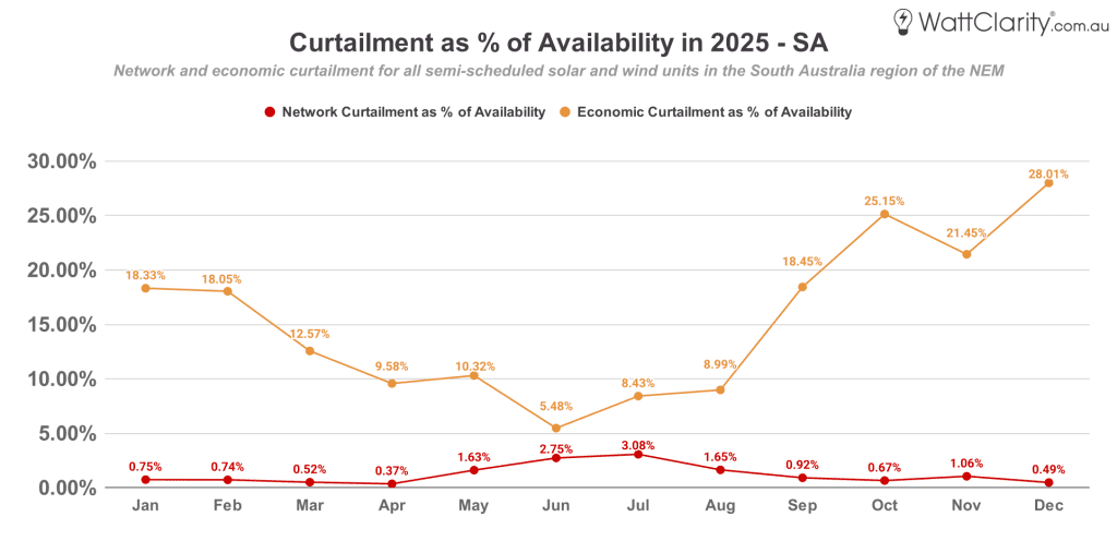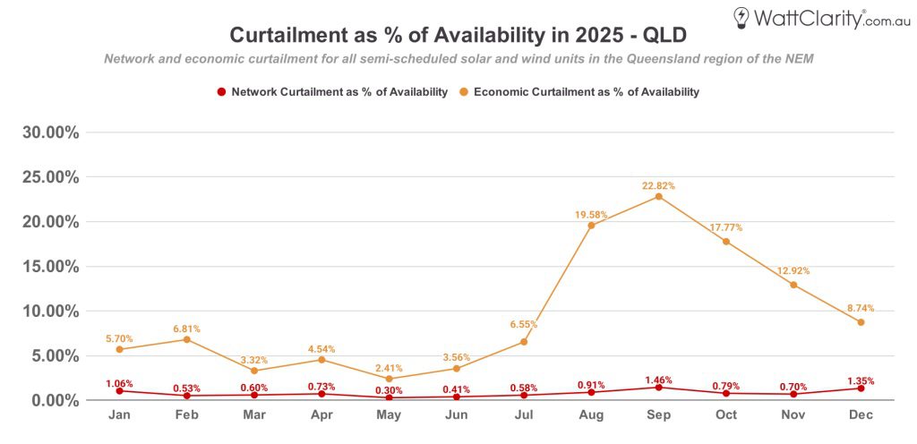 his reflects NSW’s deeper load base and greater ability to absorb VRE output without immediately pushing prices into negative territory. However, this lower exposure to price-driven curtailment is partly offset by comparatively higher levels of network curtailment, most notably from October through December.Â